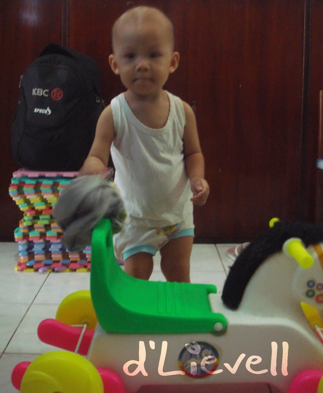 Then after a while, I found he cleaned up everything with it. He cleaned up the cupboard, the washing machine, his uncle motorcycle, Opa's chair and the last I asked him to clean up his horse riding toy. What an industrious boy!