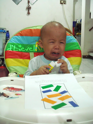 Today, I showed him the sheet and he seemed like he wanted to do. I gave him the shape and asked him to paste it. He did it just for one time and he refused after that. He insisted to play with the glue stick like he did last time. He cried enough to get the glue stick from me. Ugh!